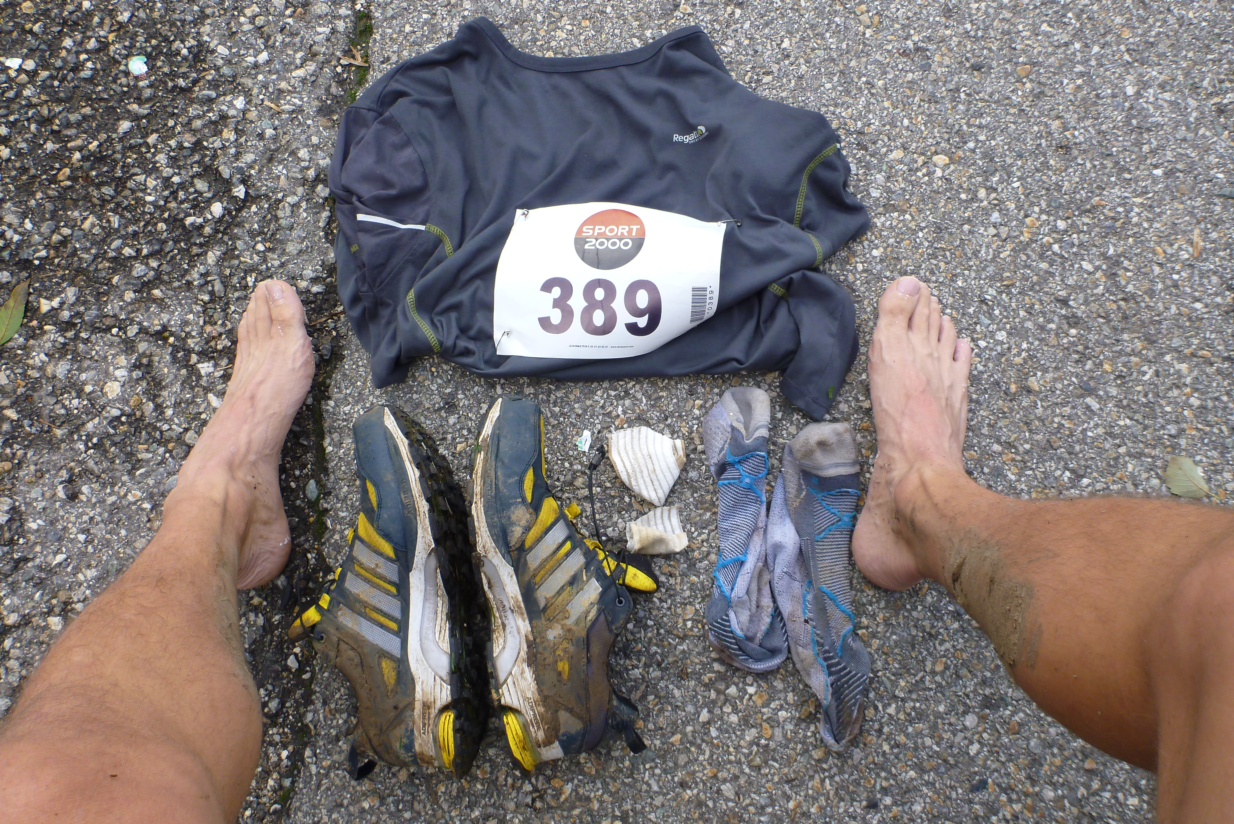 Allé, je me laisse pas faire, ça peut pas monter indéfiniment … Je me force à recourir, et puis ça doit être l’effet pâtes de fruits, ça revient tout doucement, et puis ça redescend, alors ça va mieux … Le terrain redevient méga joueur, ce qui me permet de rattraper un peu mon retard, et puis au moral, j’arrive au passage d’une rivière (un bon 30 cm d’eau, ça rafraichit !) et je me souviens que ce passage est à 2 km de l’arrivée … Alors je finis en essayant de rattraper les 2-3 coureurs que je vois devant moi … Sprint final et hop, c’est fiiiniiii !