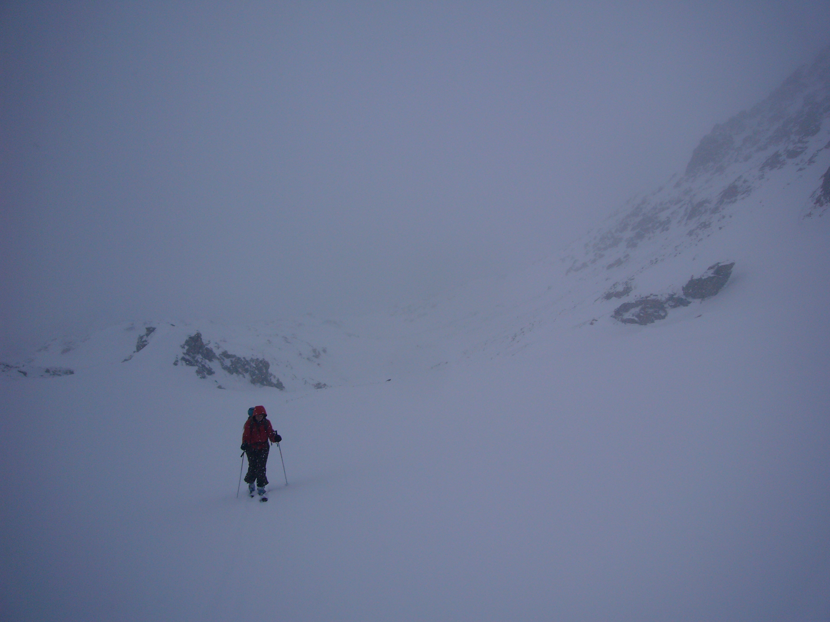 Mercredi, comme annoncé le temps est mauvais et la visibilité très limitée. Le tout agrémenté d’un risque d’avalanche non nul, c’est avec un taux de sérénité assez bas que nous continuons notre route. Fabien gère l’itinéraire en partie à la boussole via le pas de Salsa et le col de la Noire. Là haut ça souffle fort et les 100 premiers mètres de descente sont un peu raides. Voir un Fabien hésitant sur des skis, ça fait peur ! On continue dans un vallon bien moins raide mais le manque de visibilité nous donne un style de ski tout particulier. Arrivés au chaleureux Refuge de la Blanche en début d’après-midi, le contraste avec la tempête extérieure est saisissant ! Le gardien est, selon les rumeurs, quelqu’un de désagréable mais nous passons une agréable soirée au son du youkoulélé.