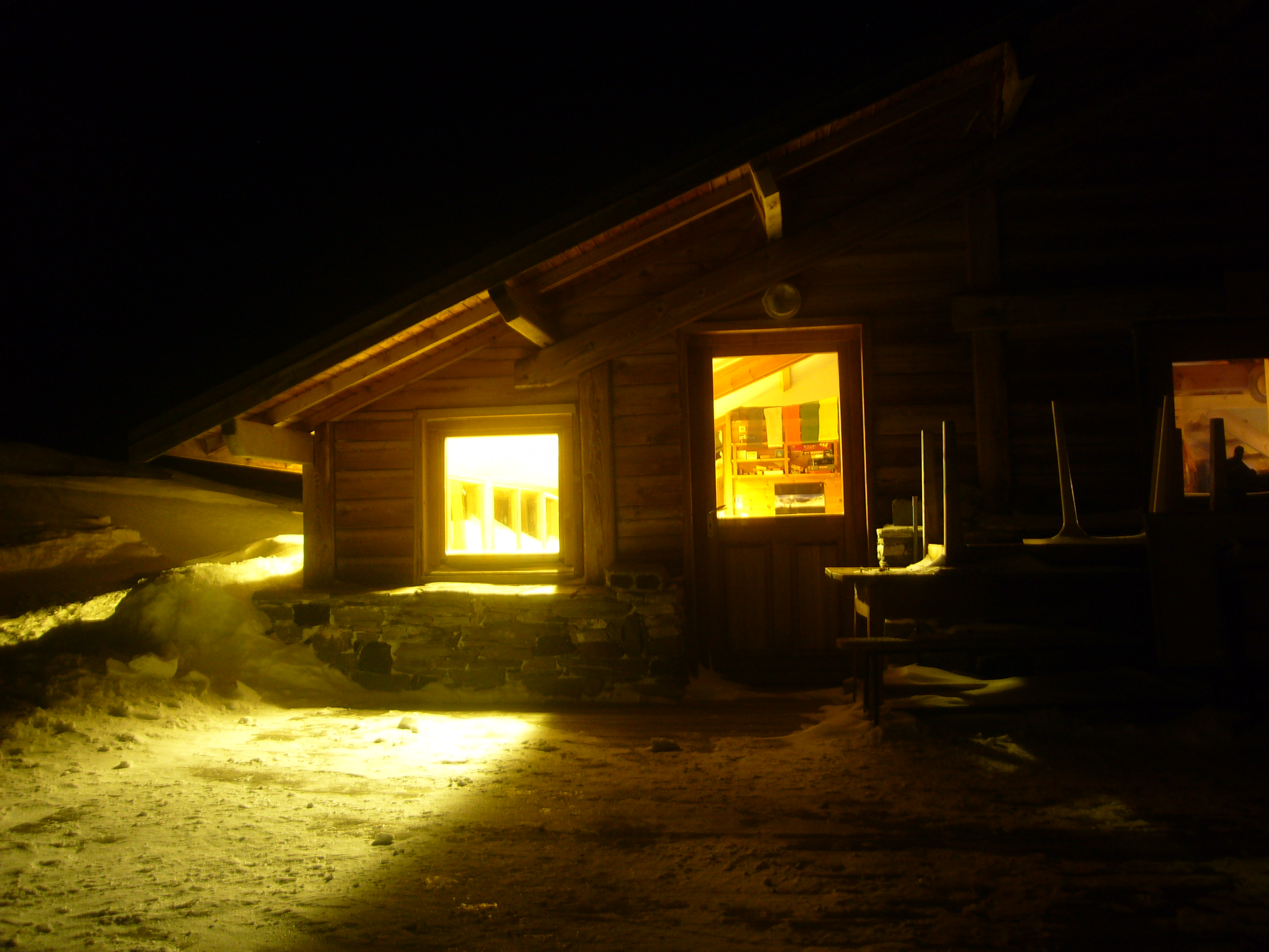 Mardi matin, nous voilà partis en direction de Maljasset, charmant petit village endormi au bout de 13 km de route enneigée. Aujourd’hui le ciel est bleu, profitons-en ! Les sacs bien chargés et les skis aux pieds on entame une longue, très longue montée jusqu’au bivouac de Mongioia. La première conversion se fera au bout d’une heure et les suivantes ne seront pas nombreuses, c’est dire la raideur de la pente…et pourtant il y a 1200m de dénivelé. J’accuse le coup du poids du sac mais les paysages sont fabuleux et nous sommes absolument seuls ! On fait une pause picnic à la bidou cabane de Rubrens mais nous dormons au bivouac Mongioia (ou Boerio) à plus de 3000 m en Italie. La porte était mal fermée et la neige et le vent on fait leur travail à l’intérieur. Après un petit déblaiement on s’installe dans ce charmant refuge qui a tout pour plaire sauf un poêle ! -5°C à notre arrivée et -11°C au réveil, on est pas déçu.