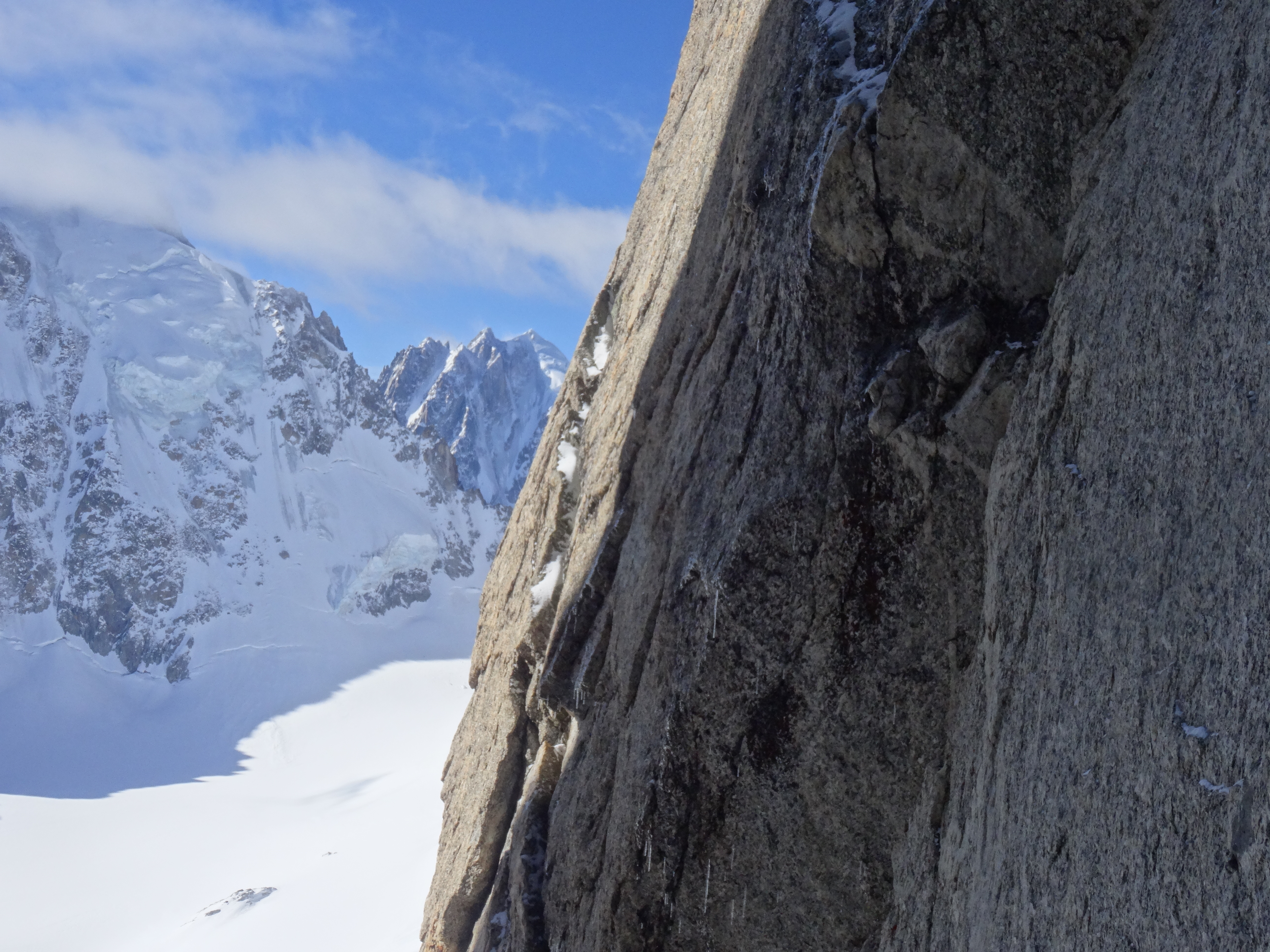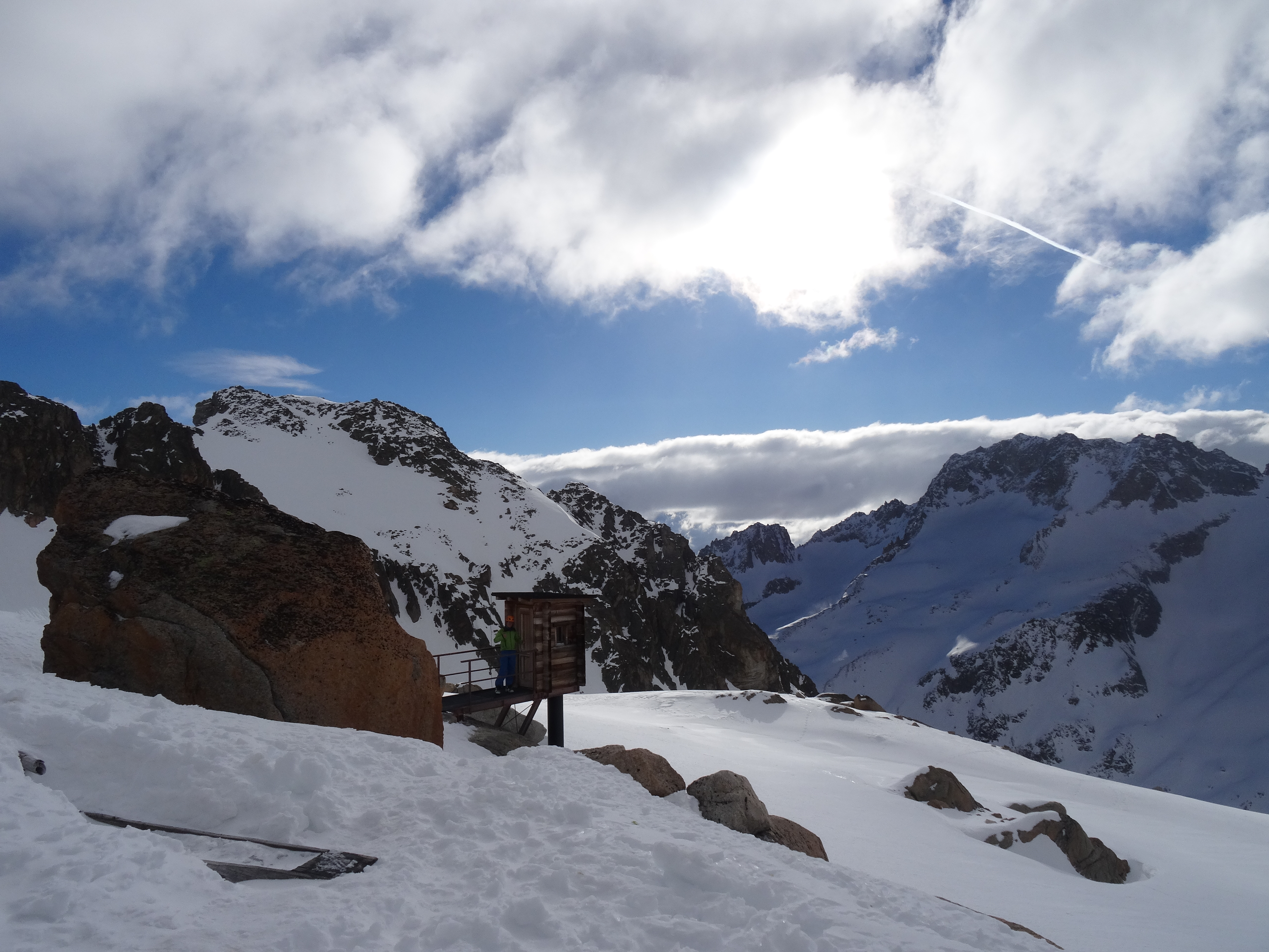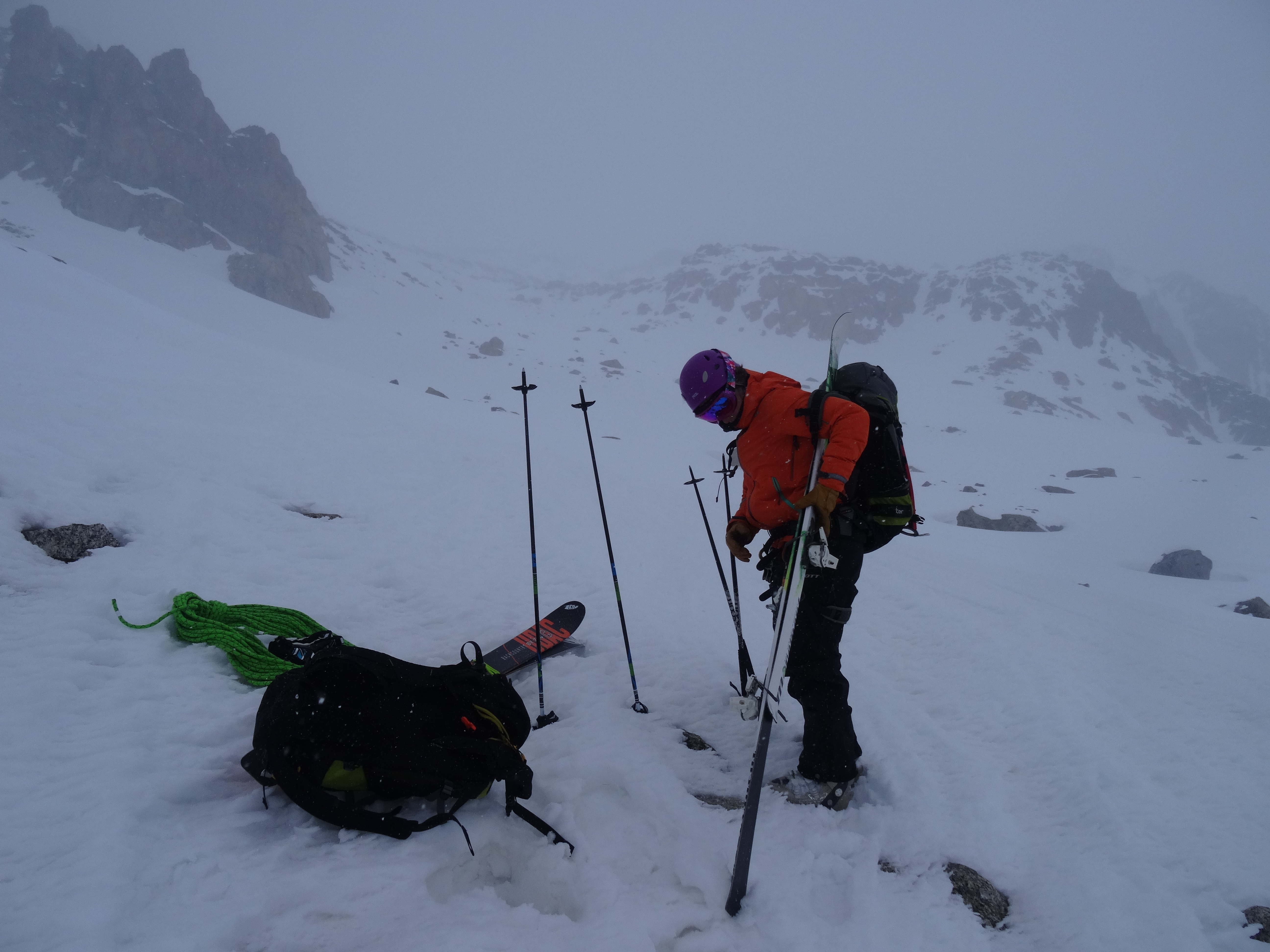 Pendant ce temps là, la météo tourne rapidement et on se fait sacrément décoiffés par de grosses bourrasques. Pour info, si vous ne plantez pas vos skis bien profondément, vous risquez de les voir se faire une virée tous seuls (vu à la TV à la pose du rappel). Bref, pas le temps de tergiverser, on tape un pitit rappel pour rejoindre le glacier.