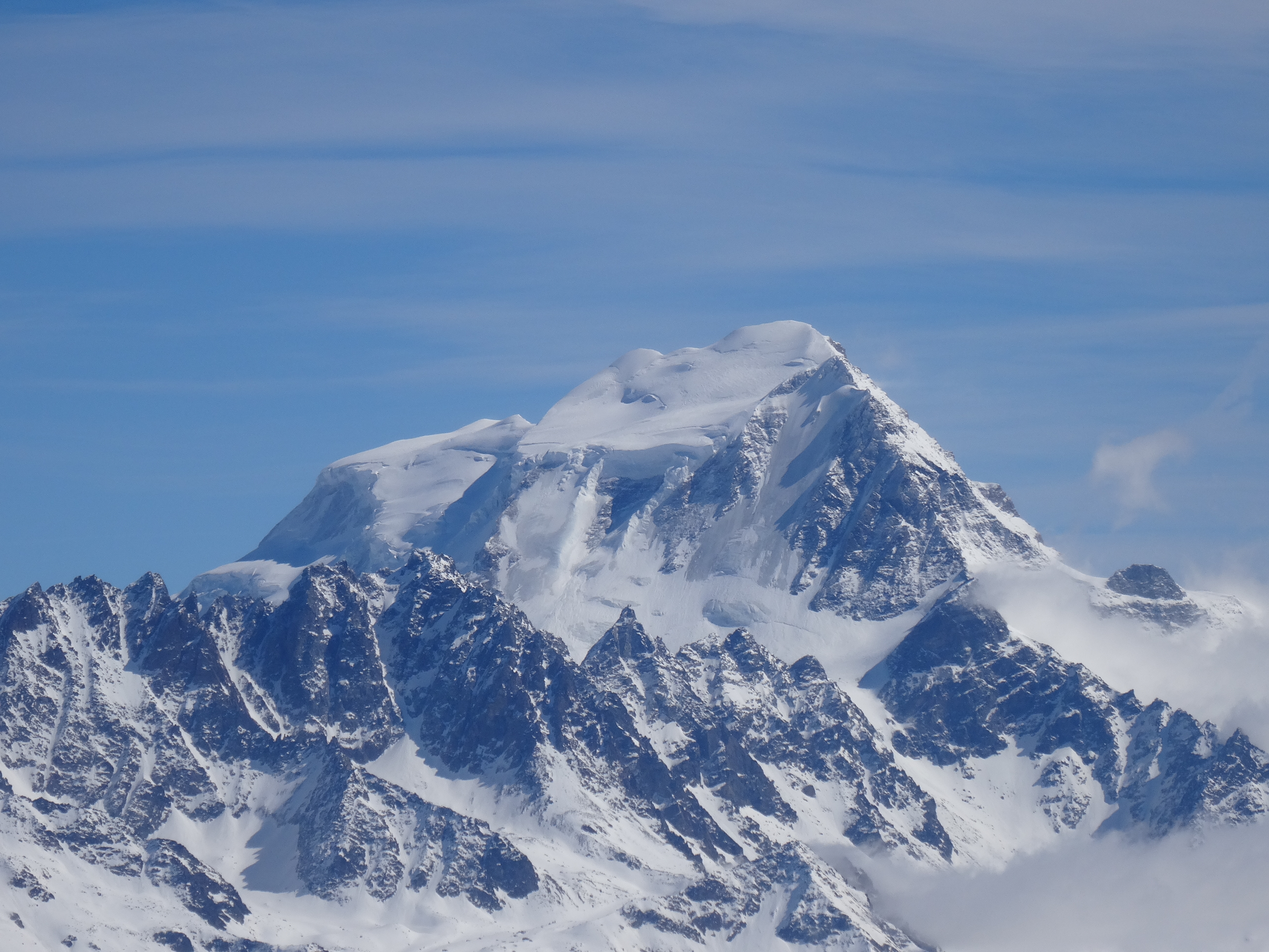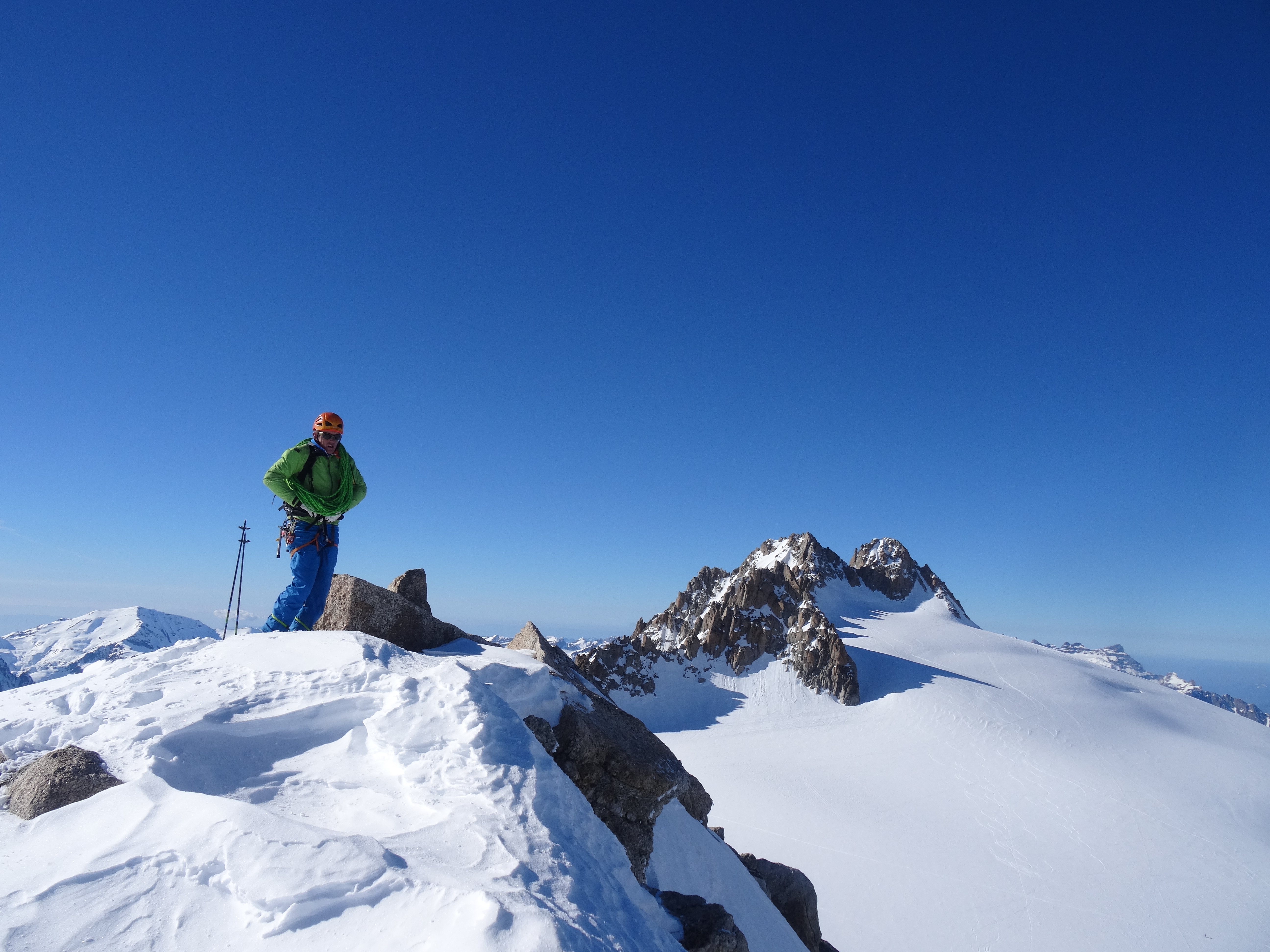 En tant que belle classique du massif, on est loin d’être tous seuls au sommet mais on décide de quitter le tumulte local pour basculer côté suisse par la face NE. Ambiance magnifique sur le haut, de bons gros virages sur le milieu et on galère un peu à trouver la sortie.