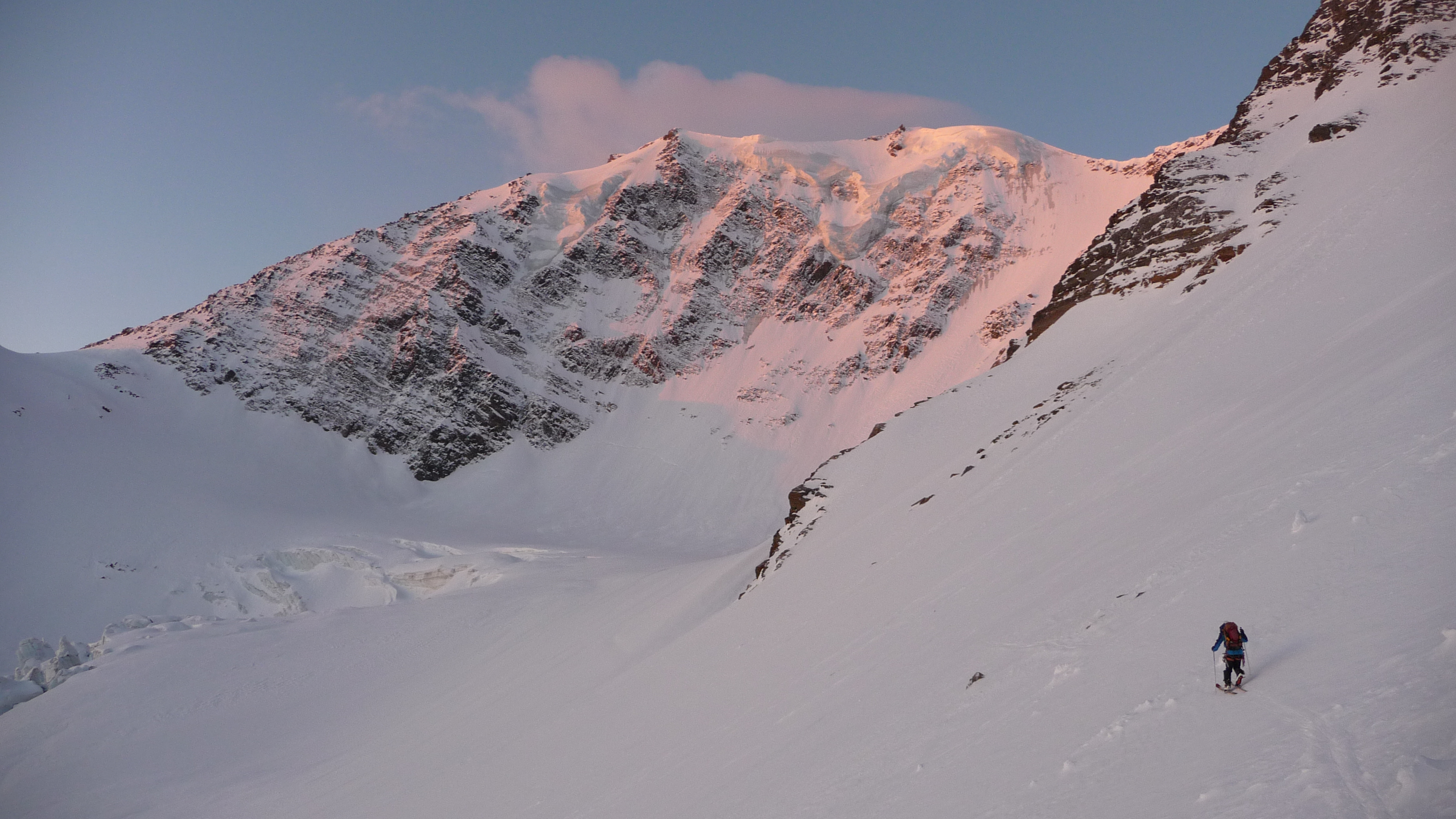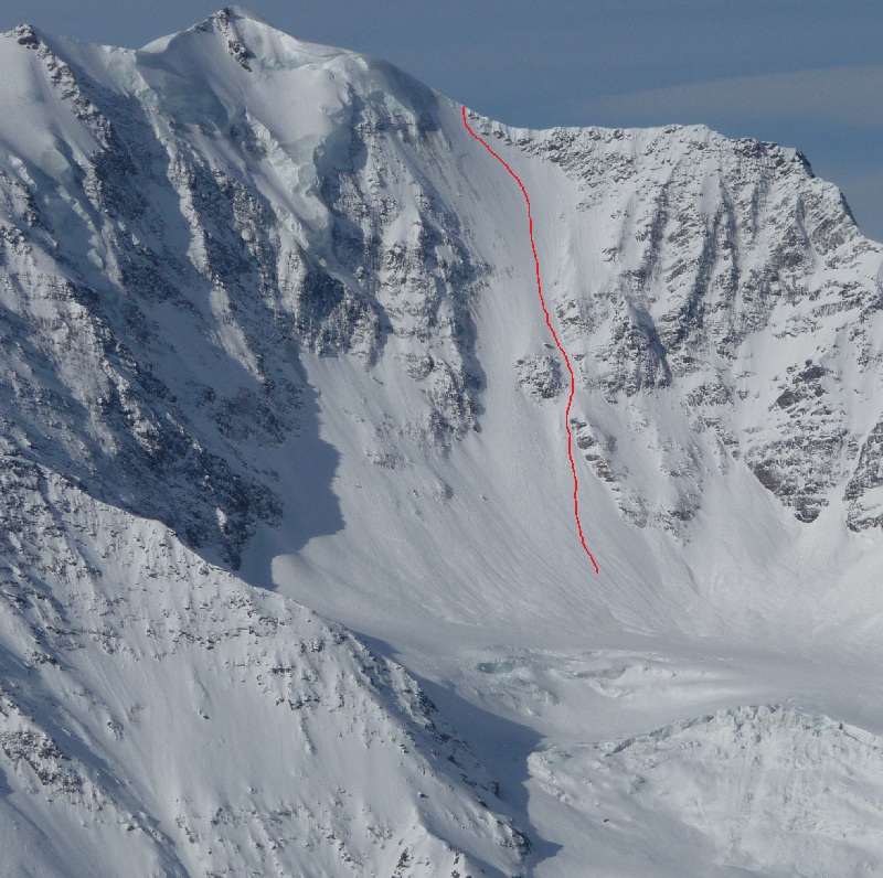 La montée de la face se fait très bien, rimaye bien bouchée, le tiers supérieur est très peu enneigé, ce qui augure une descente des plus techniques. Arrivé au sommet, Tifix tend les bras pour accrocher un 4000, mais malgré son envergure surhumaine, il échouera, le sommet a récemment été abaissé de 3995m à 3984m.
