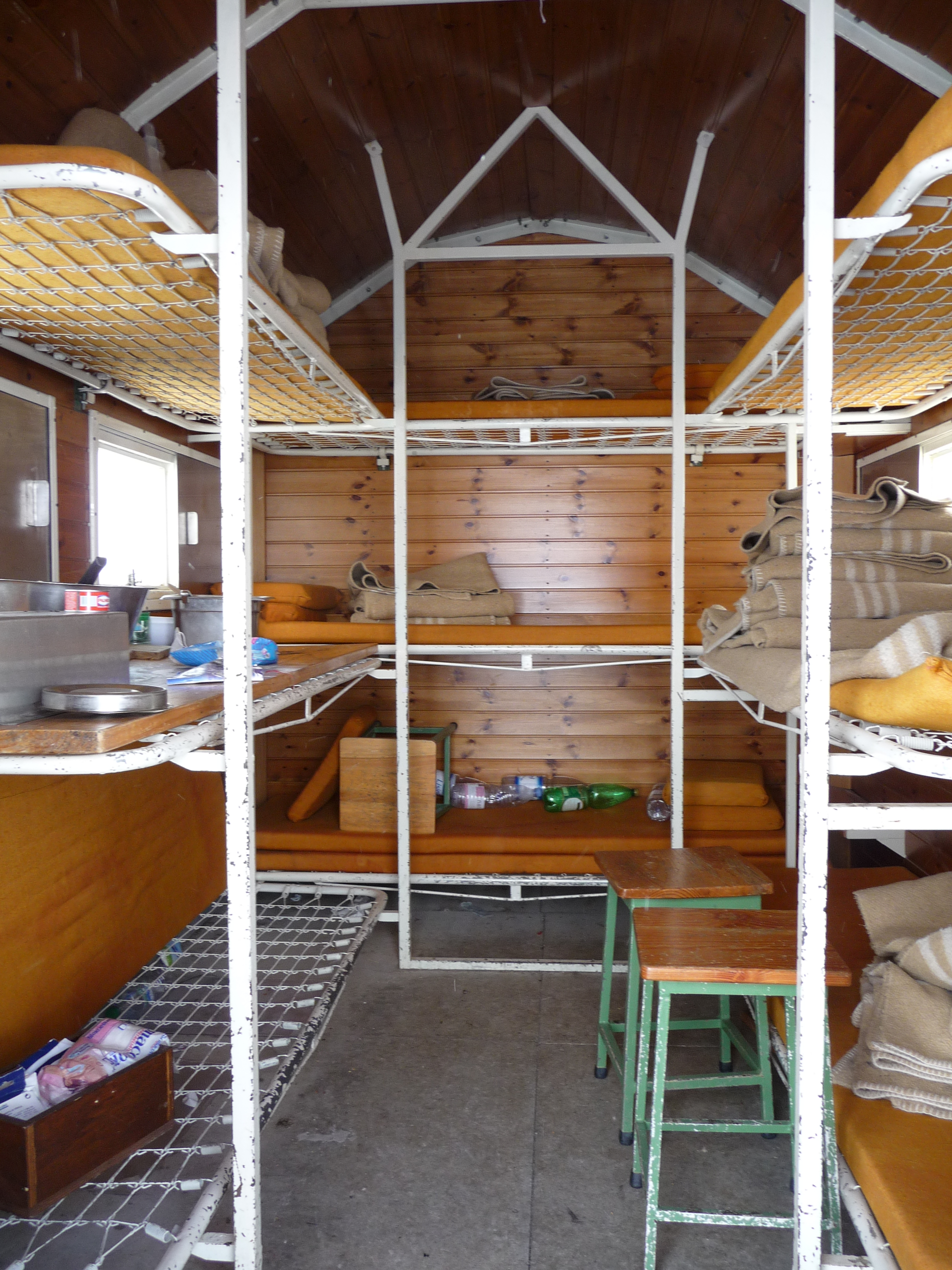 Le lendemain, nous décollons à 6h du matin d’Egga (1500m), pour se garantir une place au chaud dans le biwak Piero de Zen (3000m), qui ne comporte que 9 places, dans 10m²… Vu que l’approche ne fait que 1500m, nous partons sur une variante en mixte (herbe/rocher), plutôt que de longer tranquillement la moraine, le but étant de tenter de ne pas arriver les premiers au bivouac pour éviter de tracer la pente finale… Mais c’est raté, nous découvrons ce petit havre de paix, tout chaud tout vide.