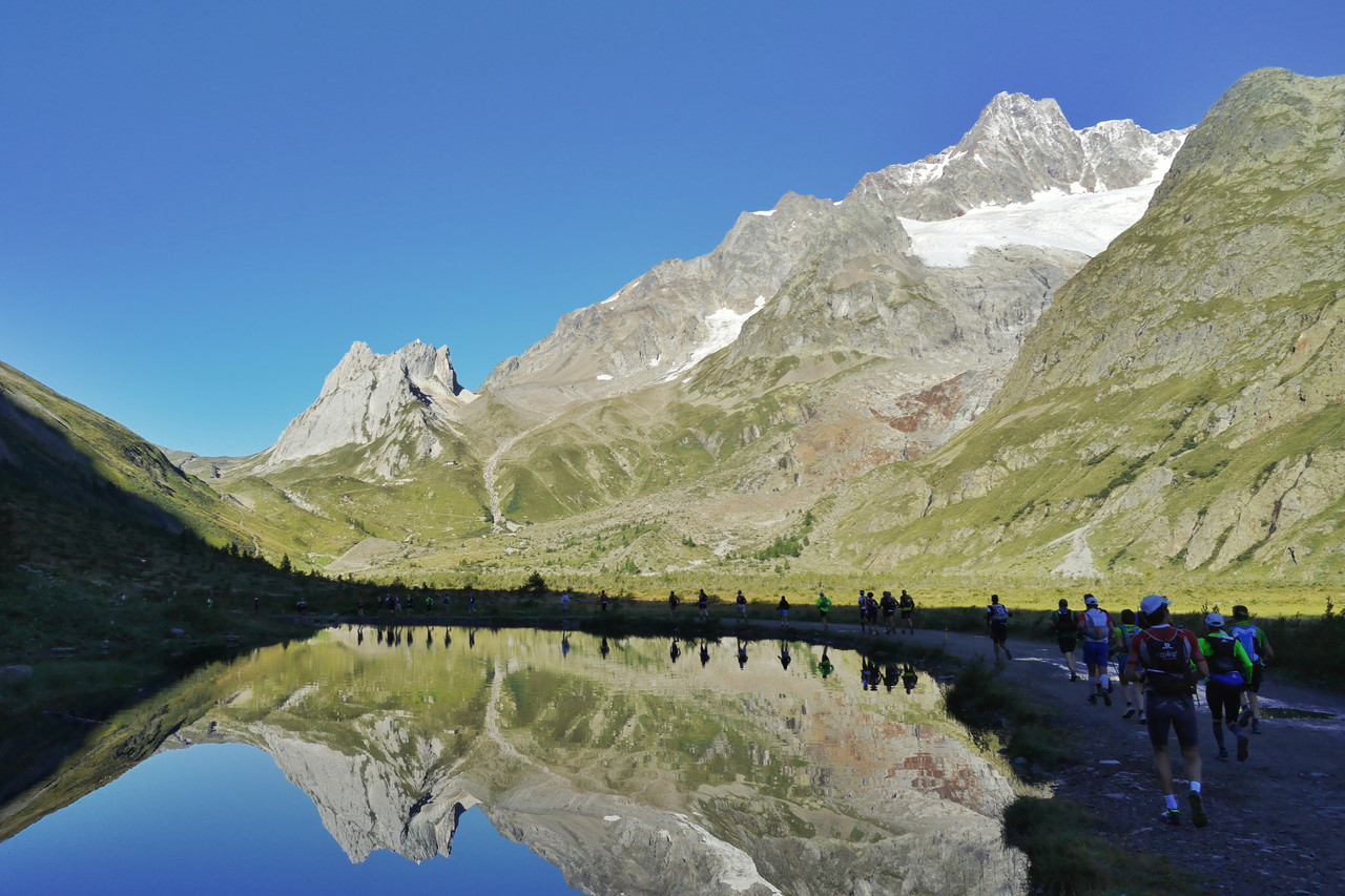 Moment d’émerveillement, la douleur d’un sommeil trop court vite remplacée par l’excitation de se confronter à un immense défi. Dans le bus qui nous amène à Courmayeur, j’ai déjà une chanson dans la tête (« l’arrière du bus… est dans le bus »…), et quelque chose me dit que ce ne sera pas la dernière ! Petit arrêt technique en descendant puis je me rends tranquillement sur la ligne de départ. Bien entendu, je suis à l’arrache, du coup j’essaie de m’incruster tant bien que mal au milieu de cette foule de coureurs venus des 4 coins du monde. Départ donné à 6H, me voilà parti la fleur au fusil dans un voyage de presque une journée complète. Les jambes sont relativement bonnes, le soleil se lève rapidement en donnant au Mont Blanc une teinte fantastique.
